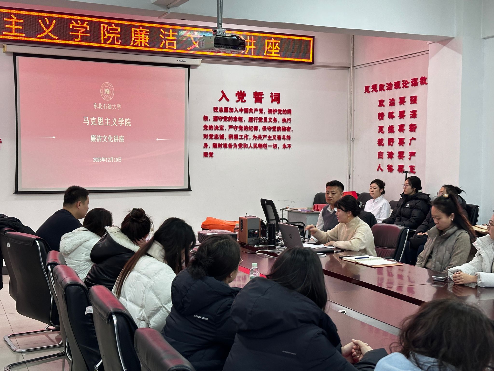 为深入推进新时代廉洁文化建设,引导全院教职工筑牢廉洁思想根基、涵养崇廉尚洁品格,12月10日下午,best365中国官方网站在机关楼211会议室成功举办廉洁文化专题讲座。本次讲座由学院纪委书记王黎黎主讲,全体教职工齐聚一堂,以《守“和”崇“廉”担使命 铸魂育人守初心》为题,共同学习探讨廉洁文化内涵,强化育人初心使命。
