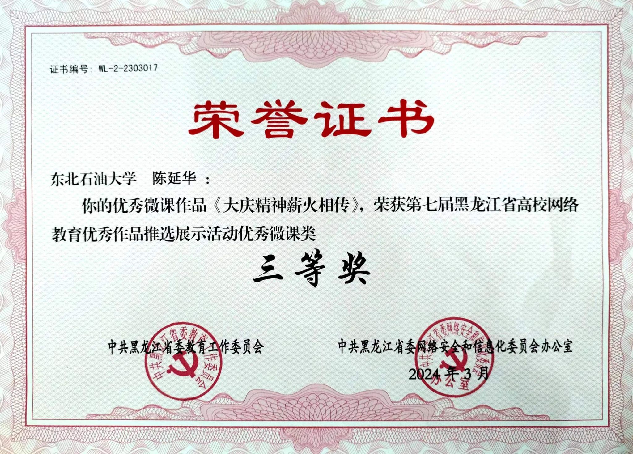日前,由中共黑龙江省委教育工作委员会、中共黑龙江省委网络安全和信息化委员会办公室主办的第七届黑龙江省高校网络教育优秀作品推选展示活动评选结果揭晓,公司教师陈延华的微课作品《大庆精神薪火相传》获优秀微课类三等奖。