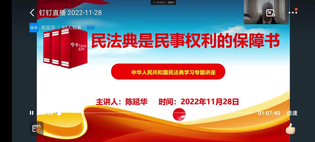 黑龙江省青年讲师团讲师、校民法典宣讲团成员、best365中国官方网站副教授陈延华于2022年11月28日、12月7日、12月8日为大庆油田电力集团新提拔基层领导、电力生产保障公司基层领导、气电公司党员宣讲民法典。宣讲充分运用习近平新时代中国特色社会主义思想的世界观和方法论,坚持系统观念,指出要把握好中国特色社会主义法治的体系这个宏观和民法典这个微观的关系,把握好国家“摸着石头过河”改革开放方法论这个整体与“成熟一个通过一个”民法典制定工作思路这个局部的关系,宣讲通过热点案例深度解读民法典的主要内容和亮点。据悉共有260余人通过钉钉直播和回放收看了宣讲,反响良好。