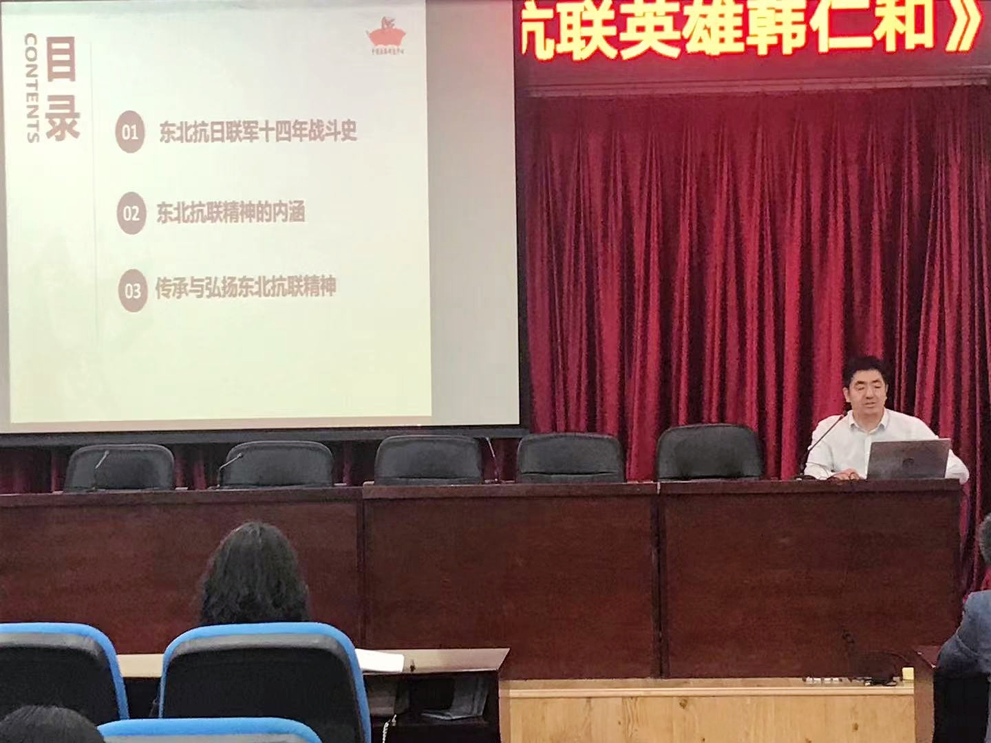 陈君以《铭记东北抗联历史,弘扬东北抗联精神》为题展开了三方面的论述。东北抗日联军是中国共产党领导的一支英雄的部队。陈君梳理了东北抗日联军十四年的艰苦战斗史,他充分肯定了中国共产党的正确领导和抗联英雄的优秀品格,并鼓励我们要认真学习东北抗联精神,即简单朴素的爱国情怀、矢志不渝的理想信念、勇往直前的战斗精神、攻坚克难的奋斗精神。最后,陈君鼓励师生积极传承和弘扬东北抗联精神,筑牢理想信念之基,立足自己的本职工作扎实开展工作,传承红色基因,自觉强化党史学习教育,学党史、强信念、跟党走。