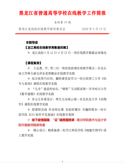 5月17日黑龙江省高校在线教学指导委员会发布了黑龙江省普通高等学校在线教学本科第19期工作简报,介绍了公司《毛泽东思想和中国特色社会主义理论体系概论》课程教师韩天澍的“立足教、学、管三位一体的思政课在线教学模式”案例,该案例是结合疫情的特殊形势对思政课教学进行积极有益的探索与实践。
