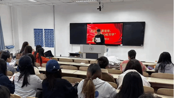 杨艺同学围绕活动主题,以“党史六对”为切入点,呼吁同学们在党建引领下找准青春坐标,在团建活动中彰显青春本色,绽放青春光彩。