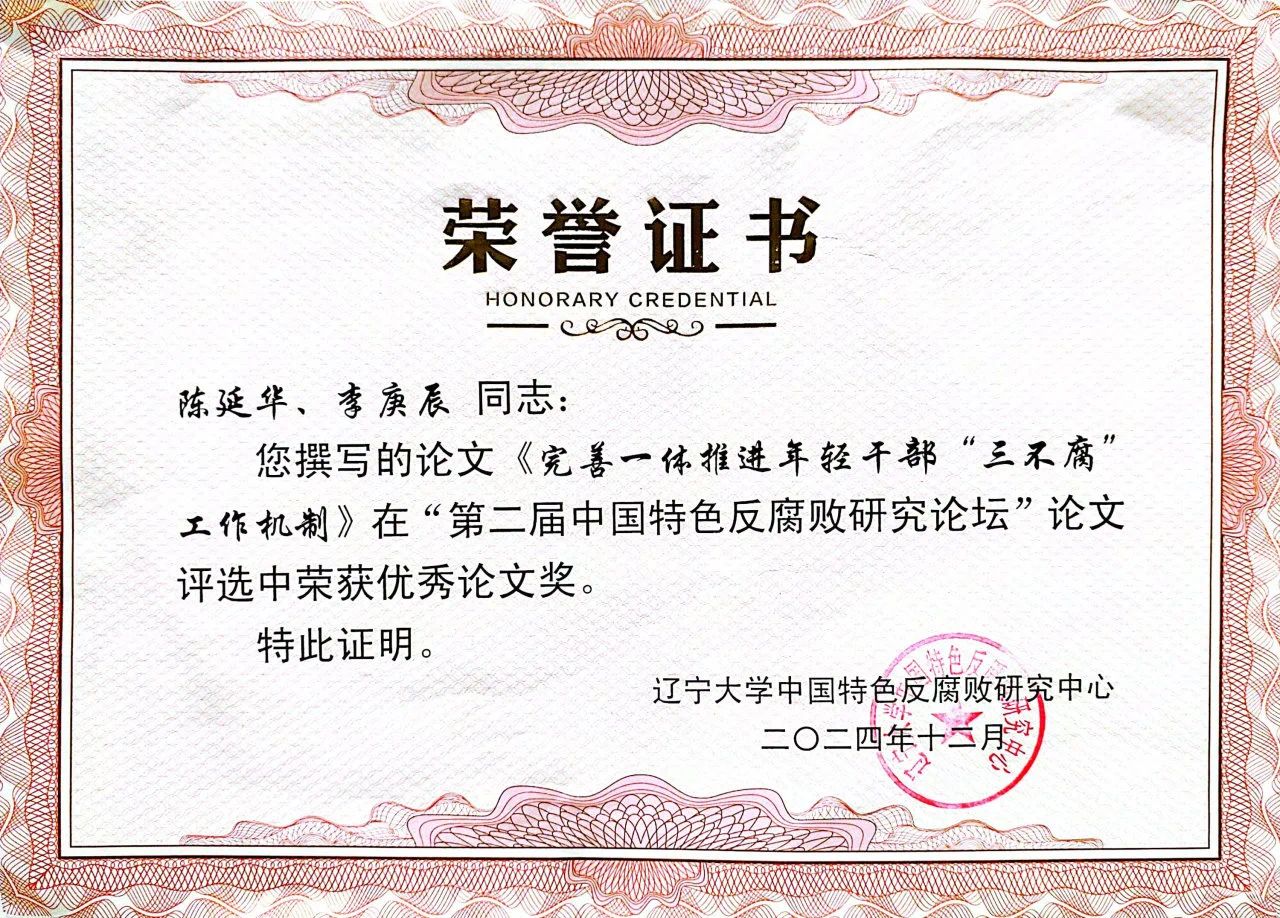 近日,公司教师陈延华、研究生李庚辰撰写的论文《完善一体推进年轻干部“三不腐”工作机制》在“第二届中国特色反腐败研究论坛”论文评选中荣获优秀论文奖。